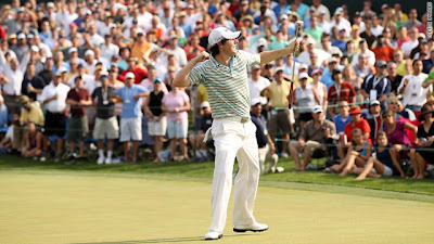 After Phil Mickelson's scintillating closing round at The Masters, I thought it might be a while before we saw another stretch of golf as good; but this Sunday, at Quail Hollow, Northern Irish phenom Rory McIlroy hit a spectacular groove in one of the best rounds anyone will ever see. Nine pars, eight birdies, an eagle; course record 10-under 62; 16-under for the weekend; started Sunday four back, wound up winning by four; capped it all with a 40-foot birdie on the 18th. "Ridiculous," really, as the golfer said himself; but hardly accidental. Jim Nantz at CBS was quick to point out that Seve, Phil, and Tiger all won on the Tour prior to their 21st birthdays; McIlroy celebrates his 21st on Tuesday, so he's in pretty nice company. He's got a tremendous gift and comes across as a charming young guy, besides; CBS commentators Nick Faldo and David Feherty (a fellow Ulsterman) could barely contain their delight, and fellow golfers Lee Westwood, Padraig Harrington, and Jim Furyk were all waiting to congratulate him as he came off the course. Good going!
